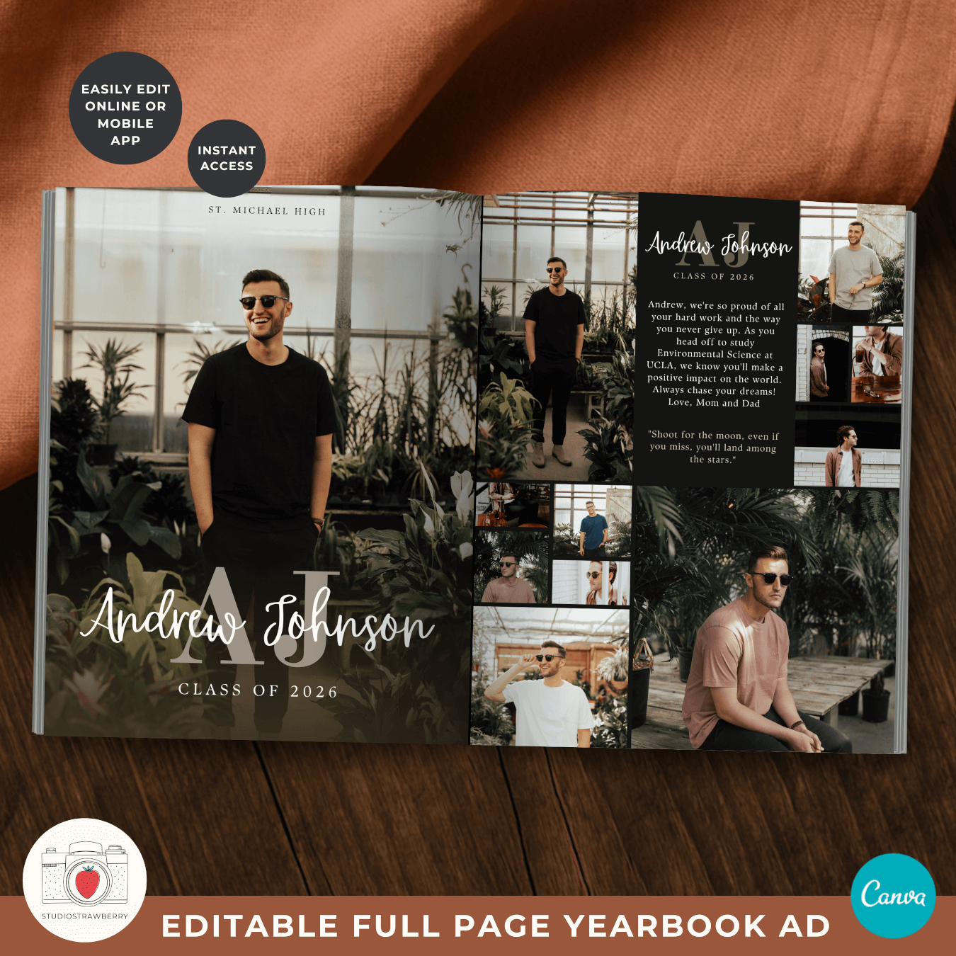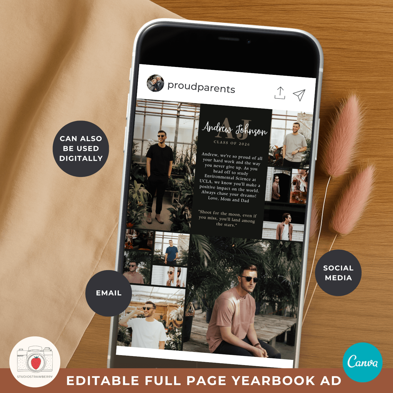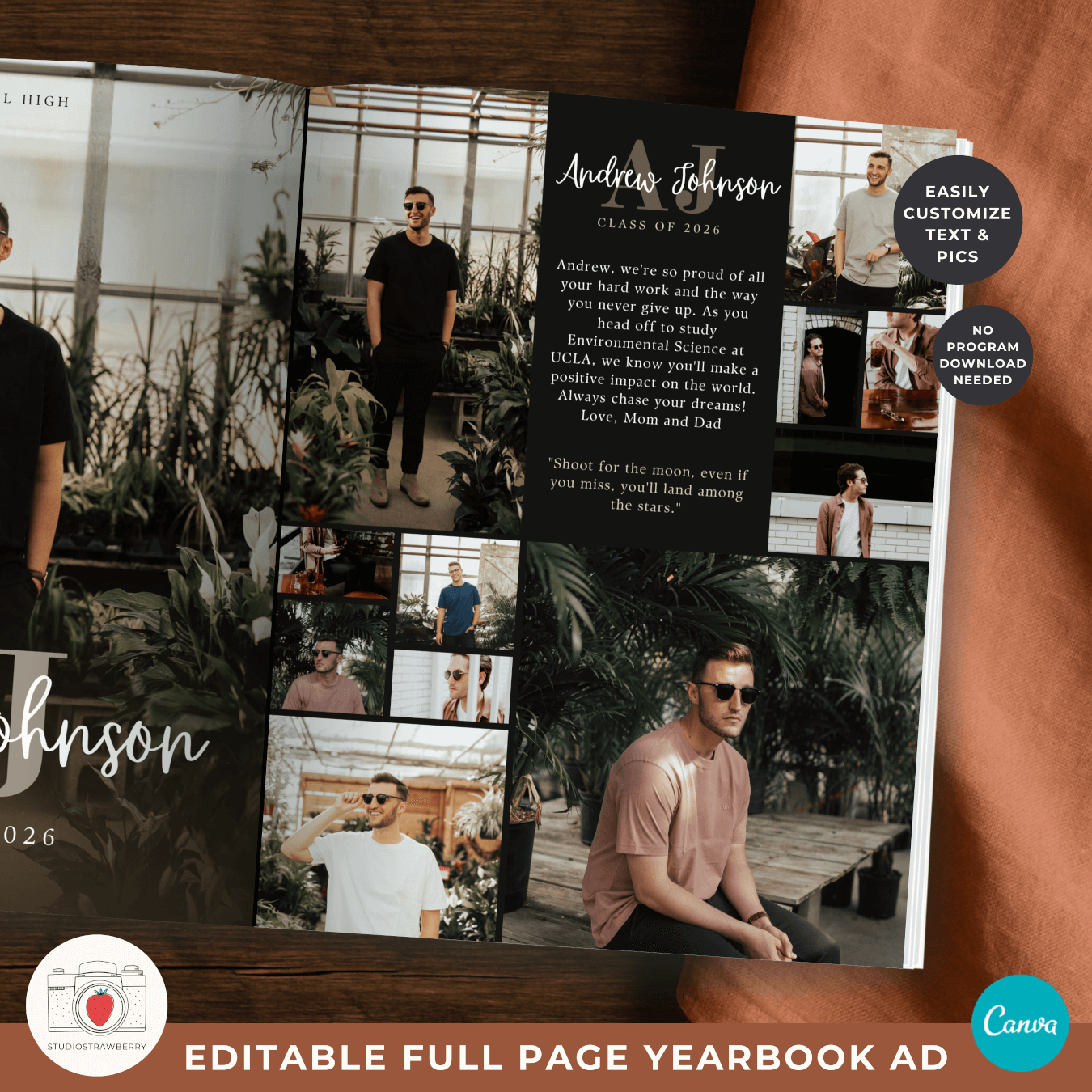 Whether you need a personalized graduation tribute, a stylish monogram yearbook page for guys, or a modern senior tribute page for son, this template makes it fast and stress-free to create something meaningful and professional. Use it for printed submissions or digital upload to your school’s yearbook staff. Parents can celebrate their son’s milestone with a high-quality photo collage design that stands out, making this one of the best choices for an editable yearbook ad for son.