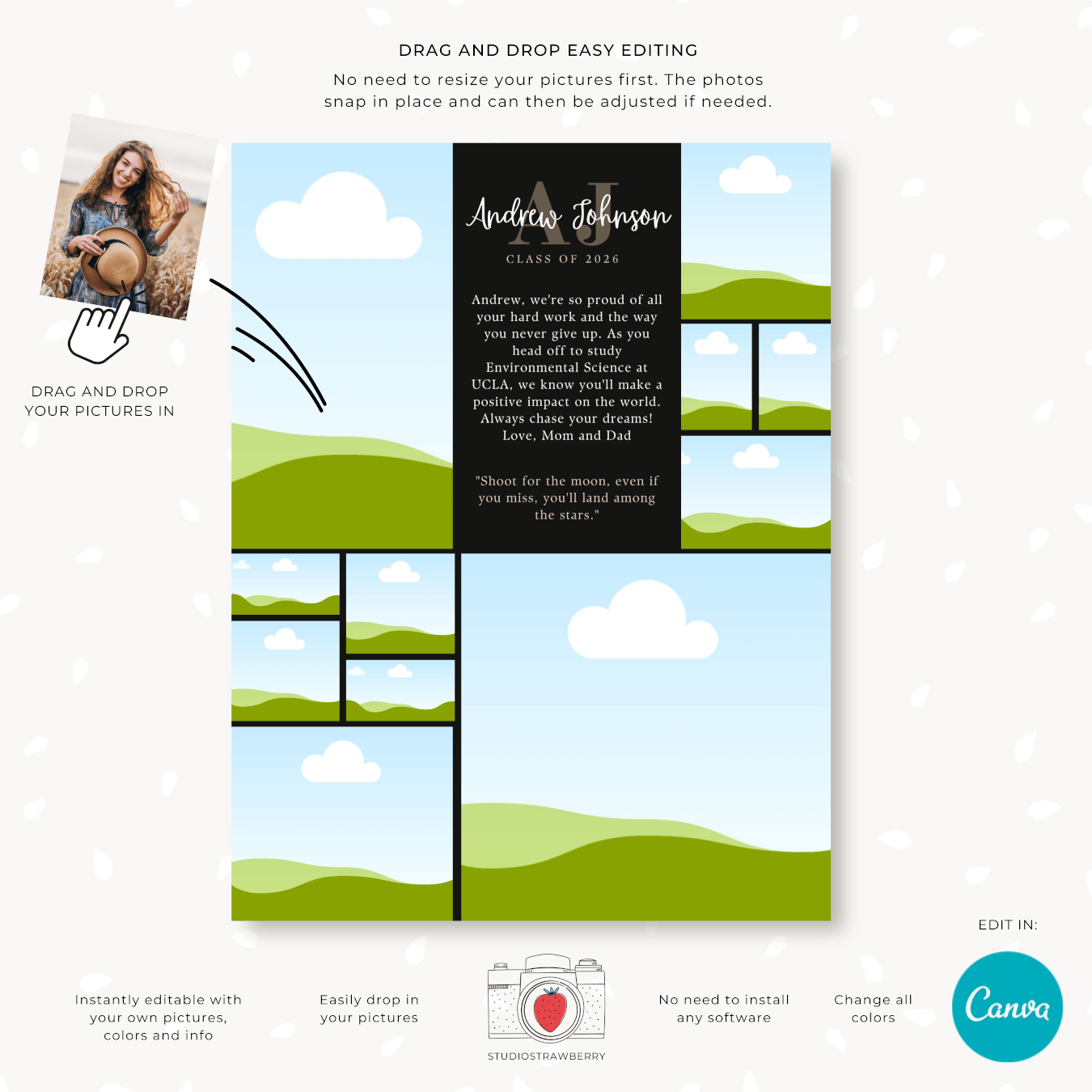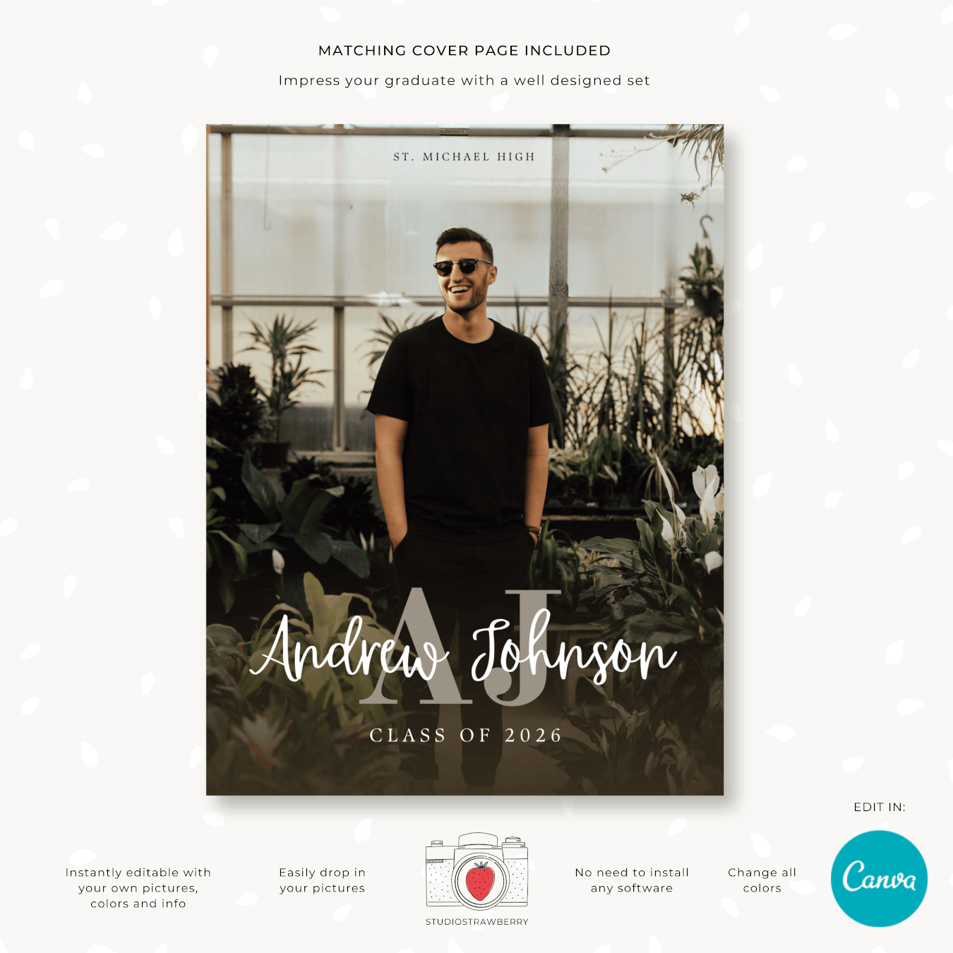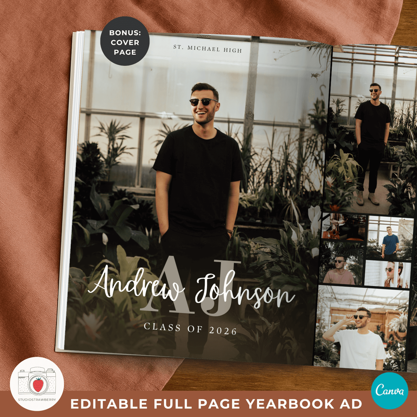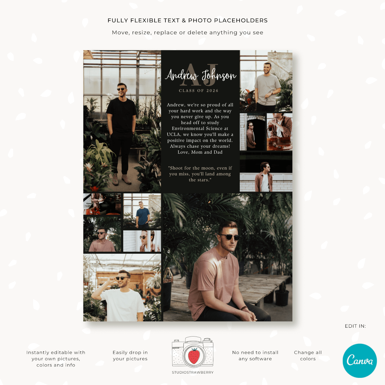 Whether you need a personalized graduation tribute, a stylish monogram yearbook page for guys, or a modern senior tribute page for son, this template makes it fast and stress-free to create something meaningful and professional. Use it for printed submissions or digital upload to your school’s yearbook staff. Parents can celebrate their son’s milestone with a high-quality photo collage design that stands out, making this one of the best choices for an editable yearbook ad for son.