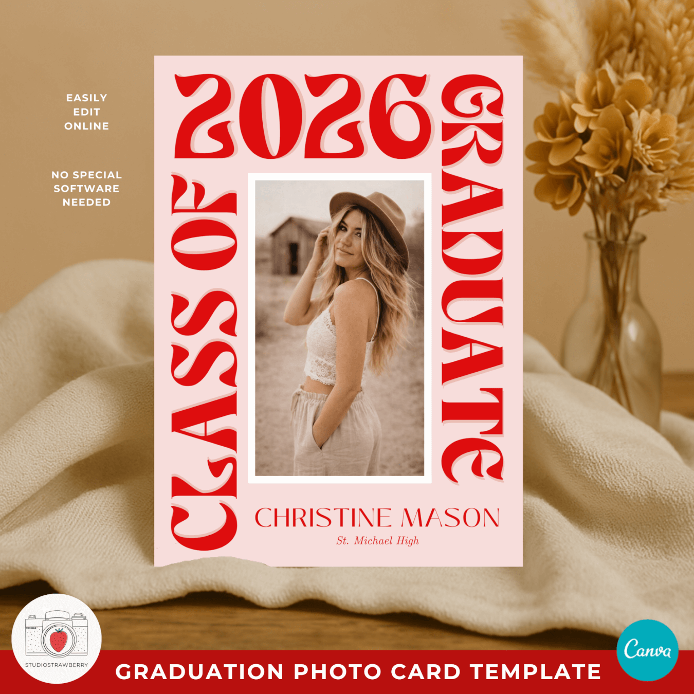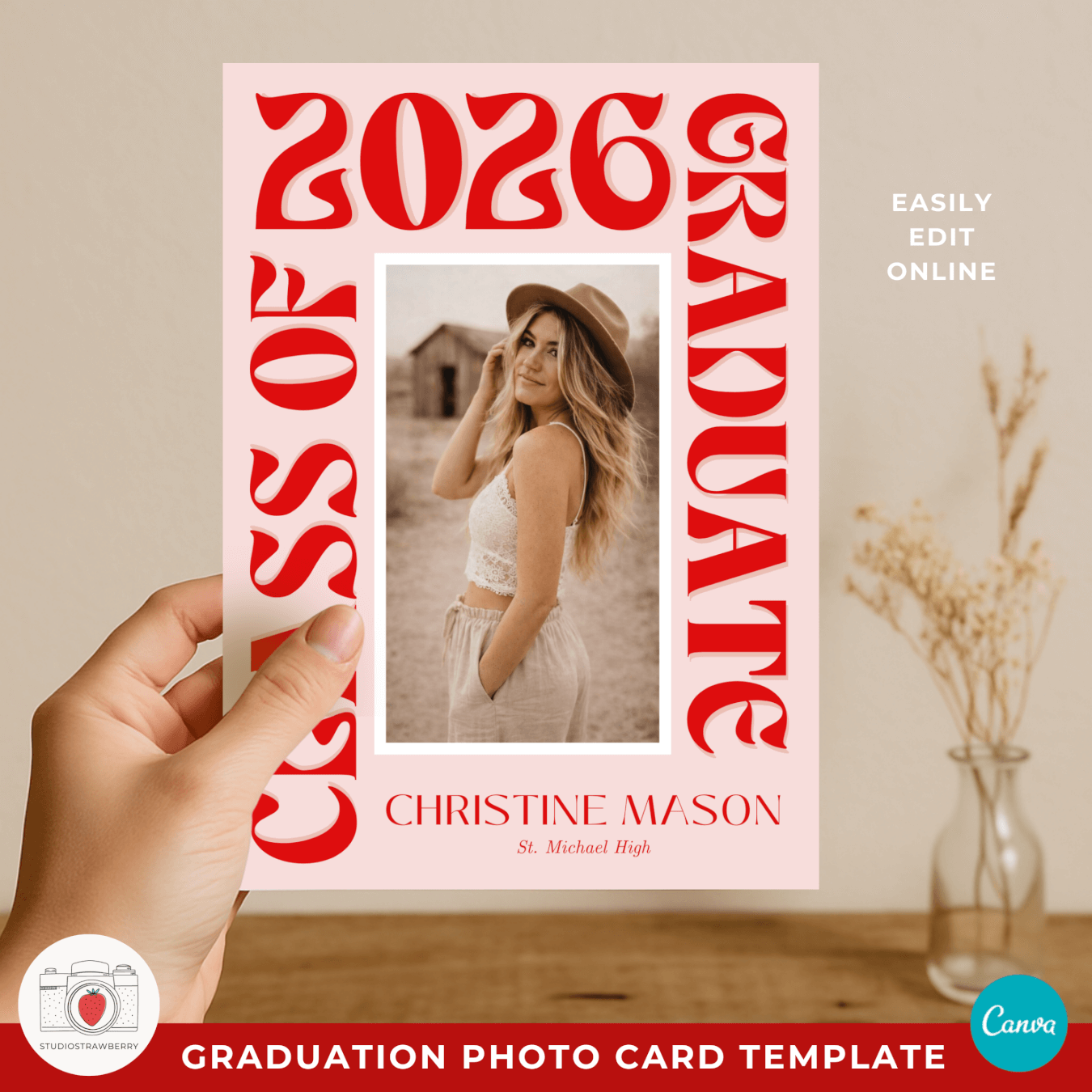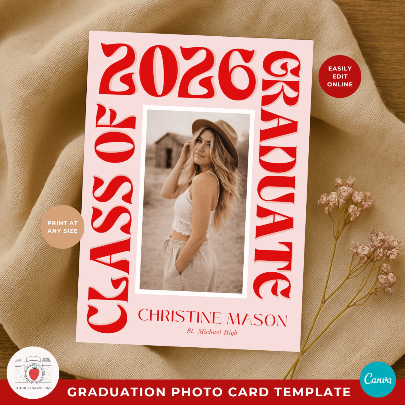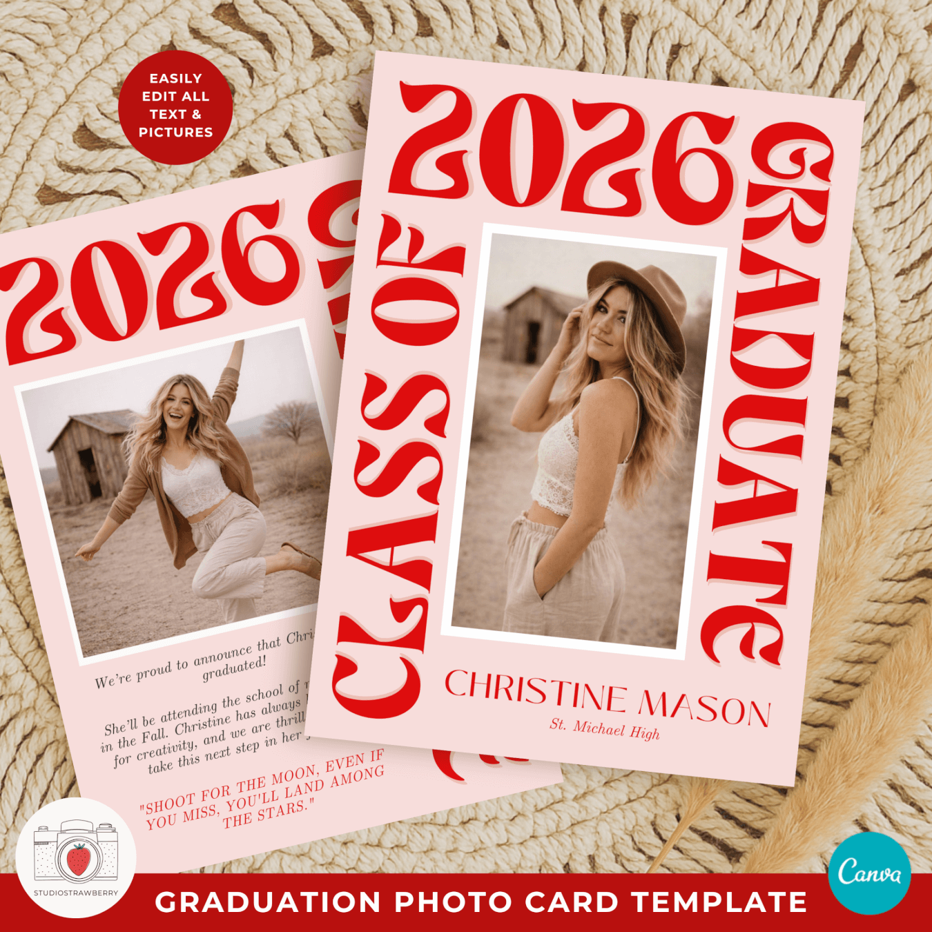 This retro graduation photo card template is designed for seniors and families who want a bold, trendy way to celebrate graduation with a modern, eye catching look. Featuring big funky wording, oversized lettering, and a playful modern retro grad announcement card style, this template stands out from traditional graduation announcements. It works perfectly as a class of 2026 photo announcement template, a senior graduation announcement Canva design, or a high school graduation photo card template.