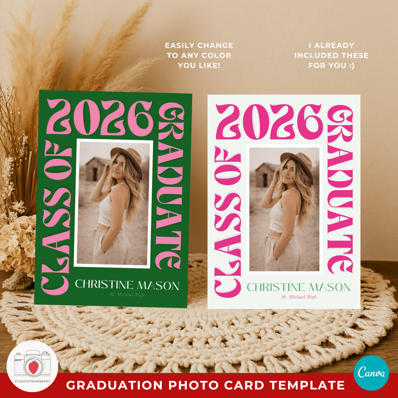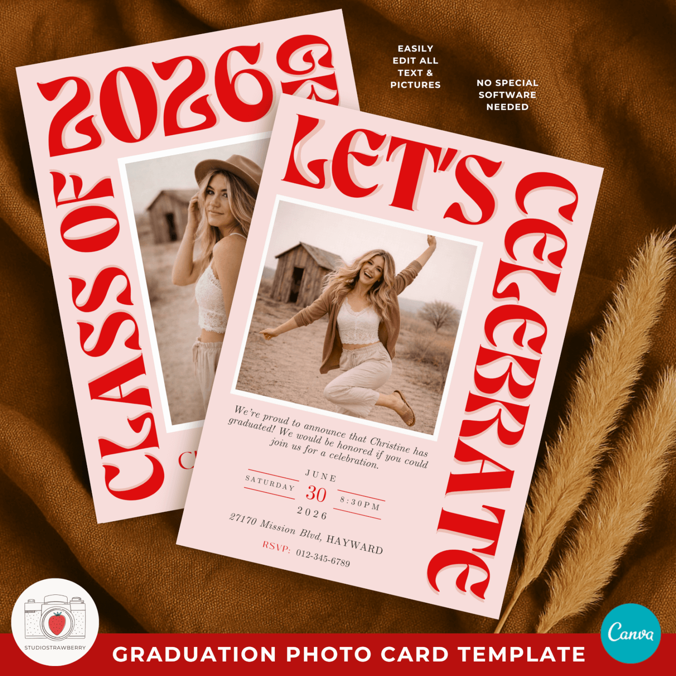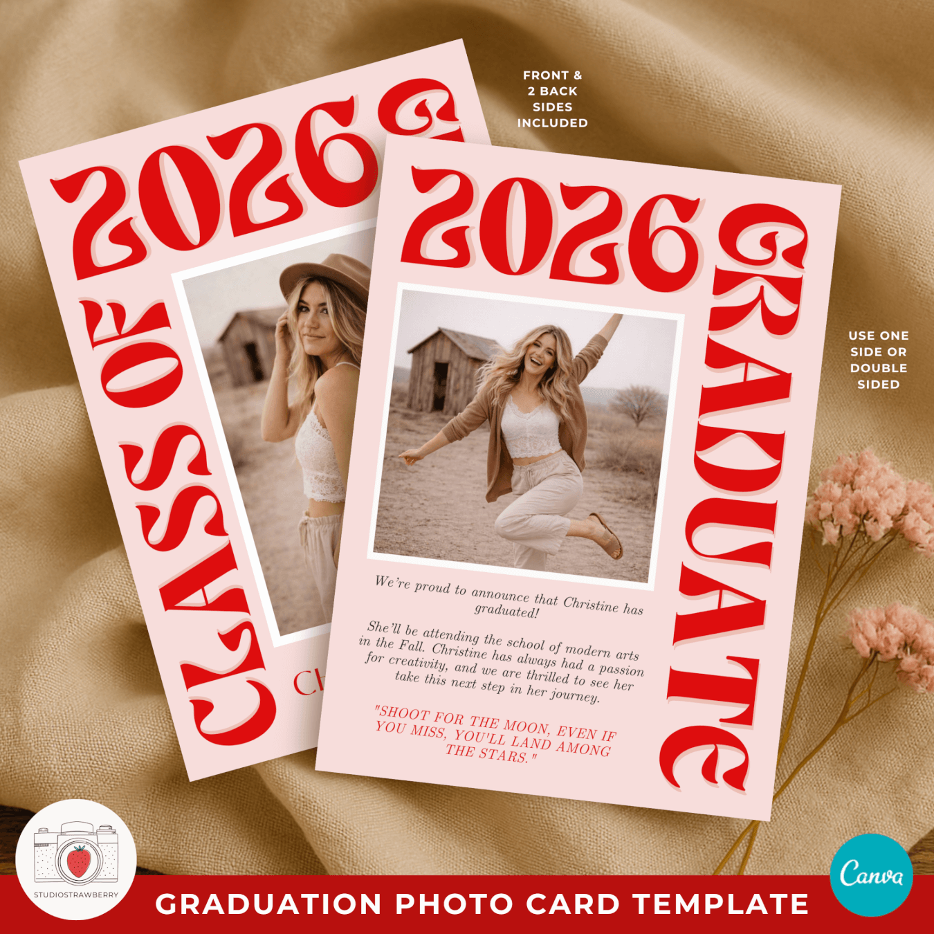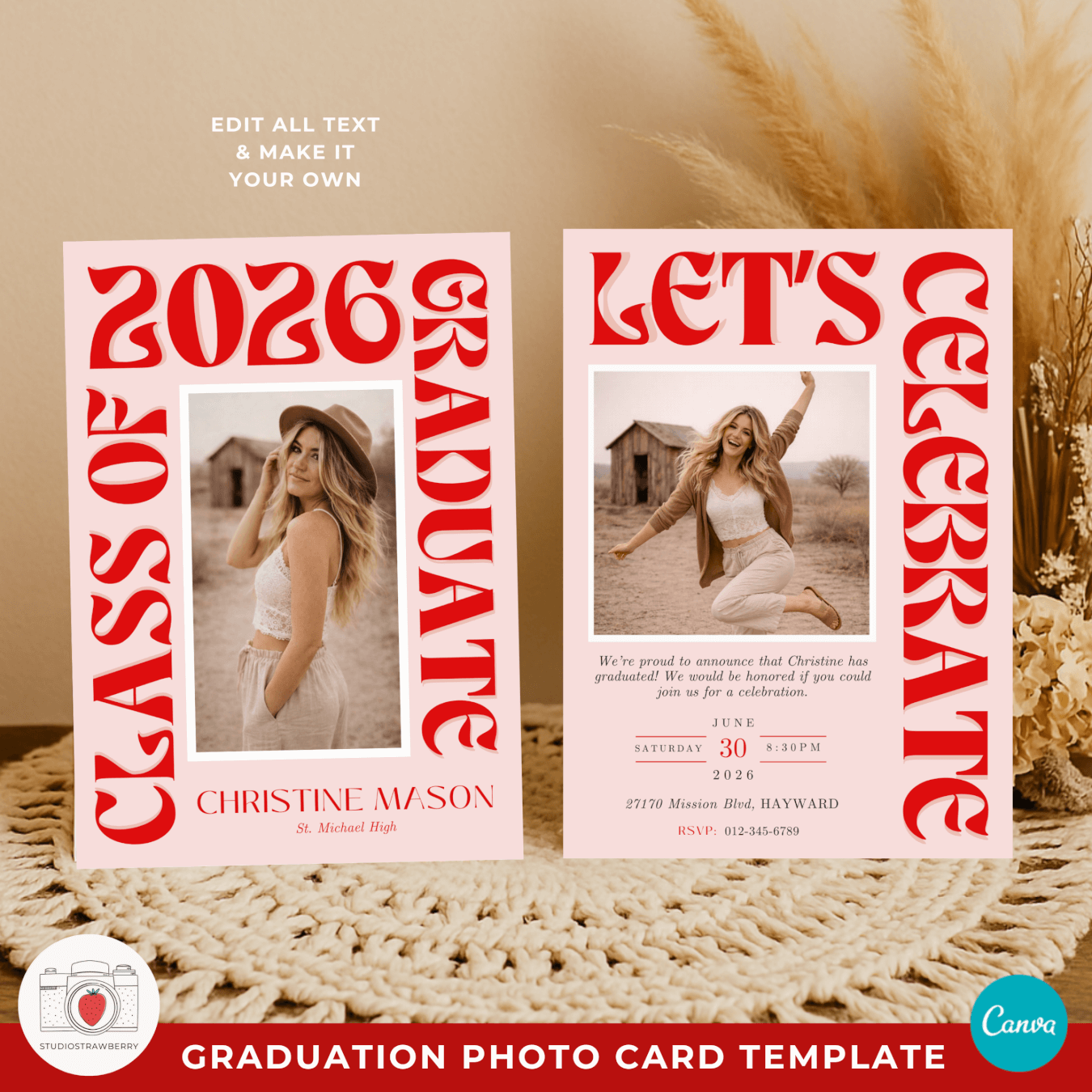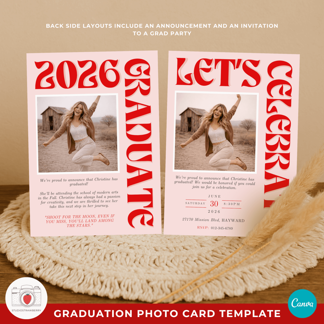 This editable graduation announcement template includes a front design and two back side layouts in one Canva project: one version for a graduation announcement and one for a modern funky graduation party invite. You can customize colors to create a retro pink graduation announcement or adapt it to any color palette that fits your style. The big lettering graduation card template makes the graduate’s year and name stand out instantly, creating a memorable and stylish keepsake.
