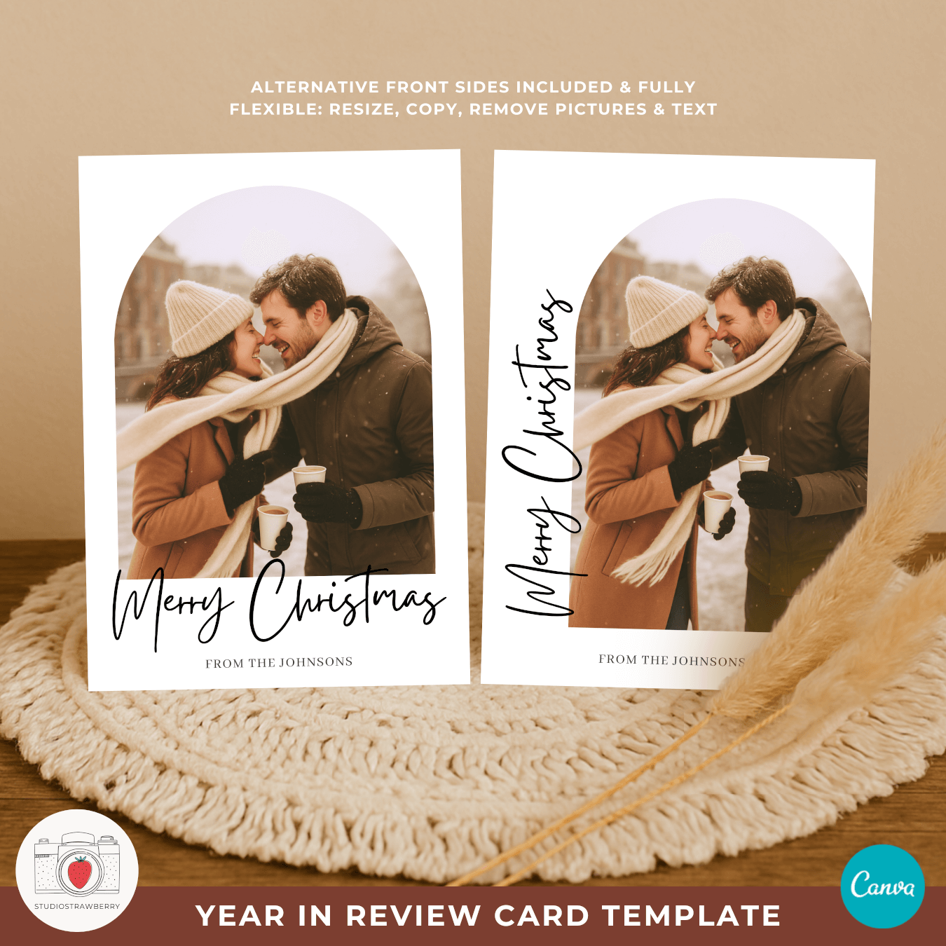 Choose the double sided Christmas card template for a keepsake with a story, or keep it simple with a front and back photo Christmas card that matches your style. The layout works as an arch photo collage template for a quick year recap holiday card template, a family year in review template, or a romantic couple year in review card.