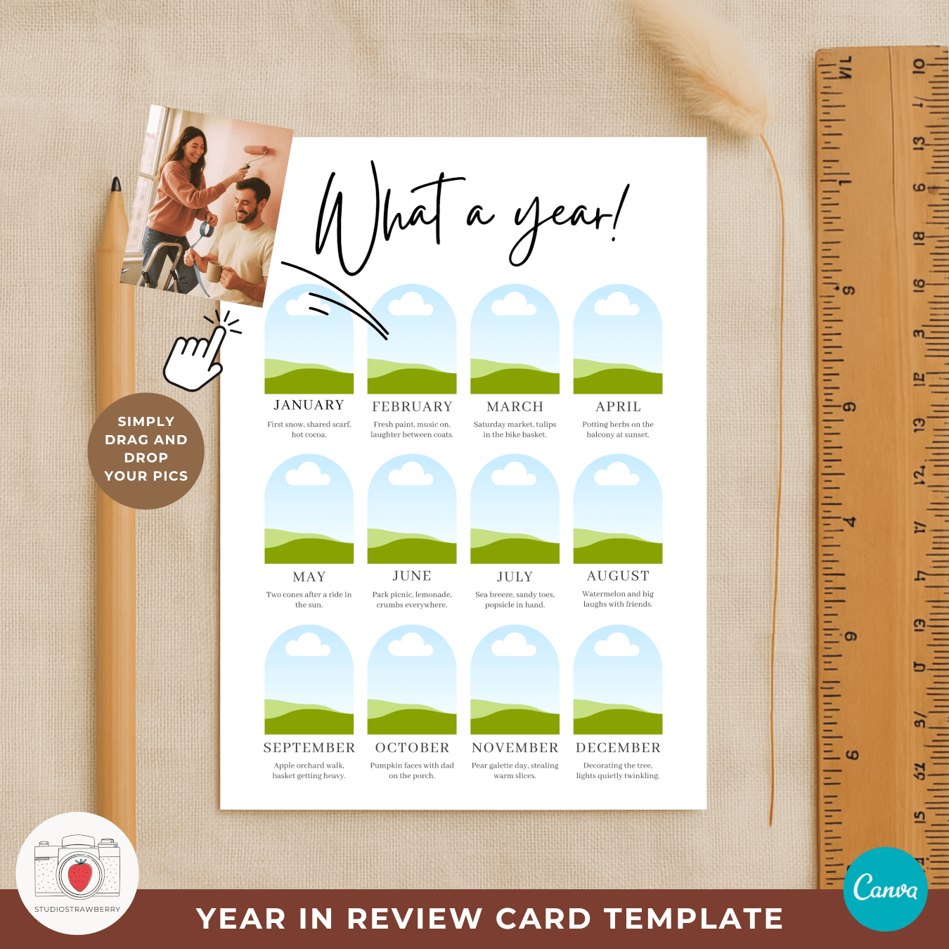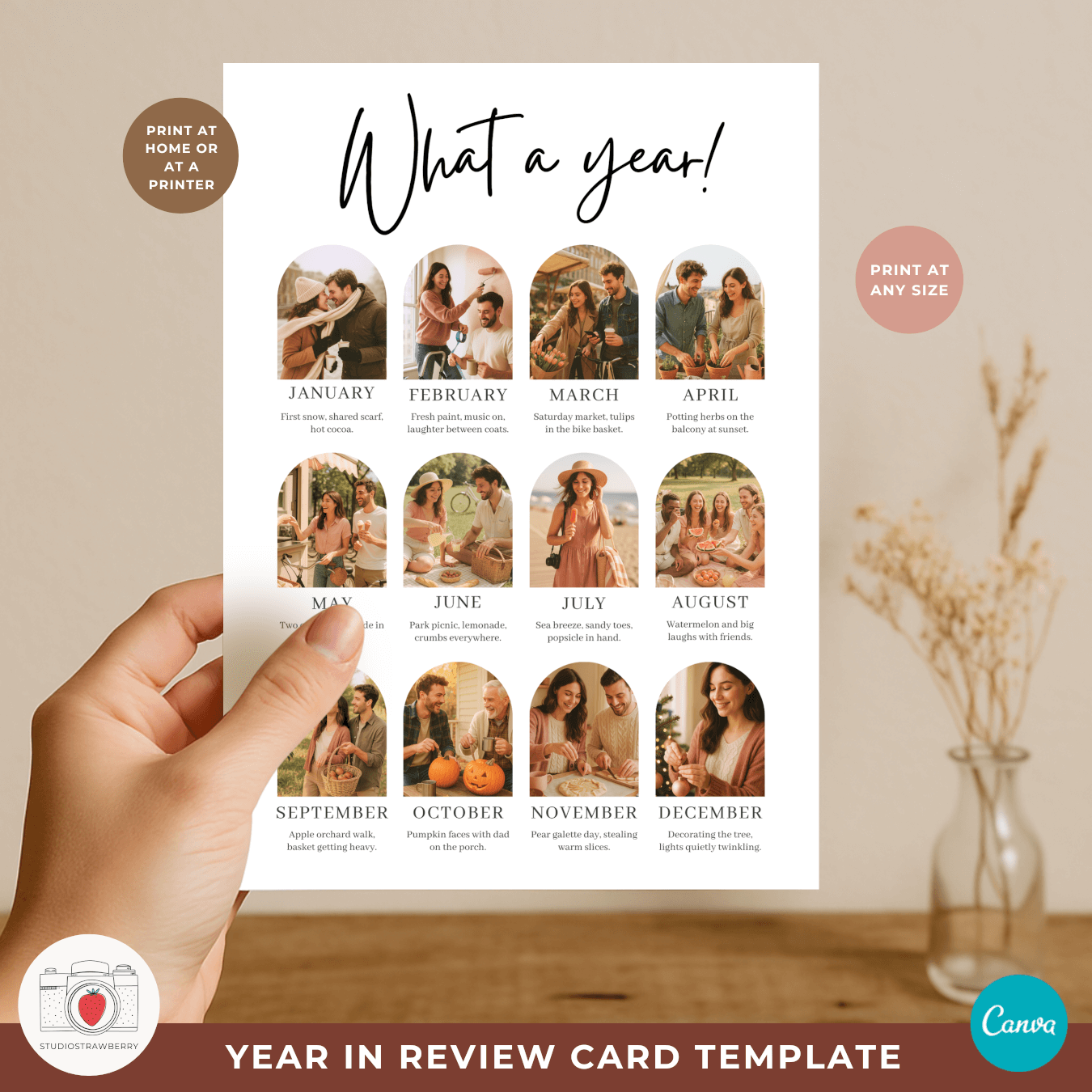 Share your year beautifully with a printable year in review card template Canva that pairs a clean single-photo front with a 12 month photo collage template on the back. The design features soft arch windows and modern typography, perfect for couples and families who want a polished what a year holiday card they can print at any size. Customize every detail in Canva, from captions to colors, then download for professional printing or digital sharing.