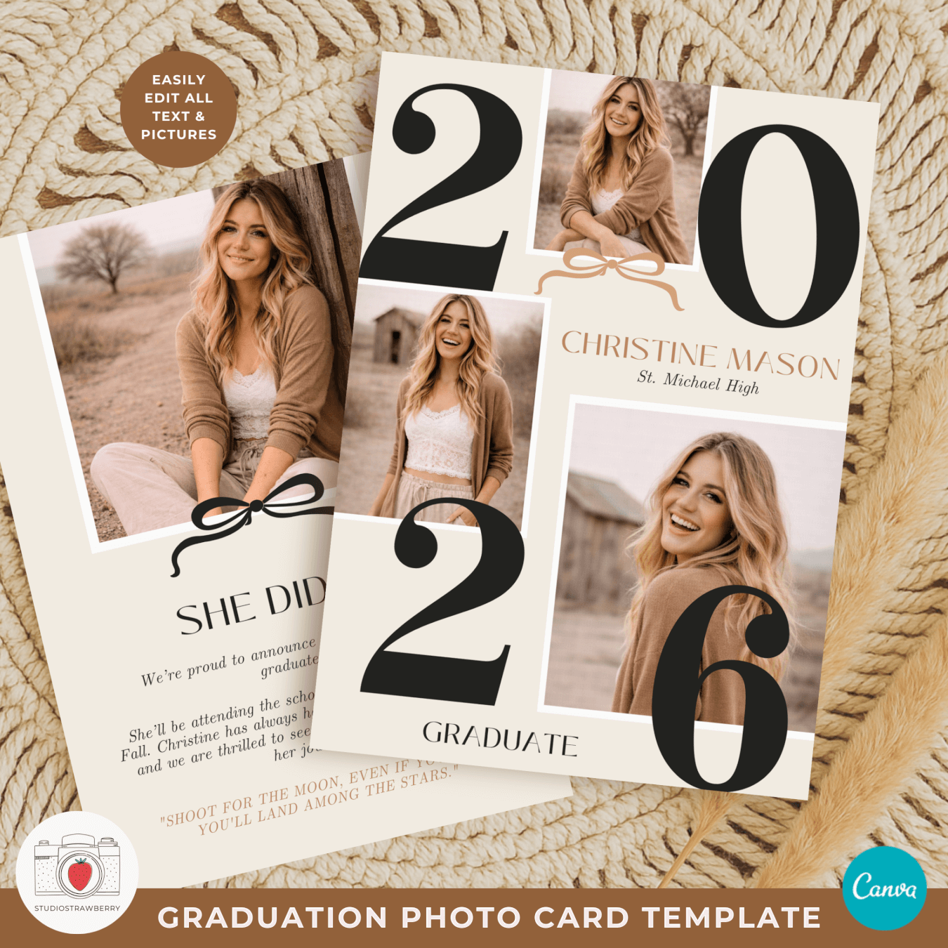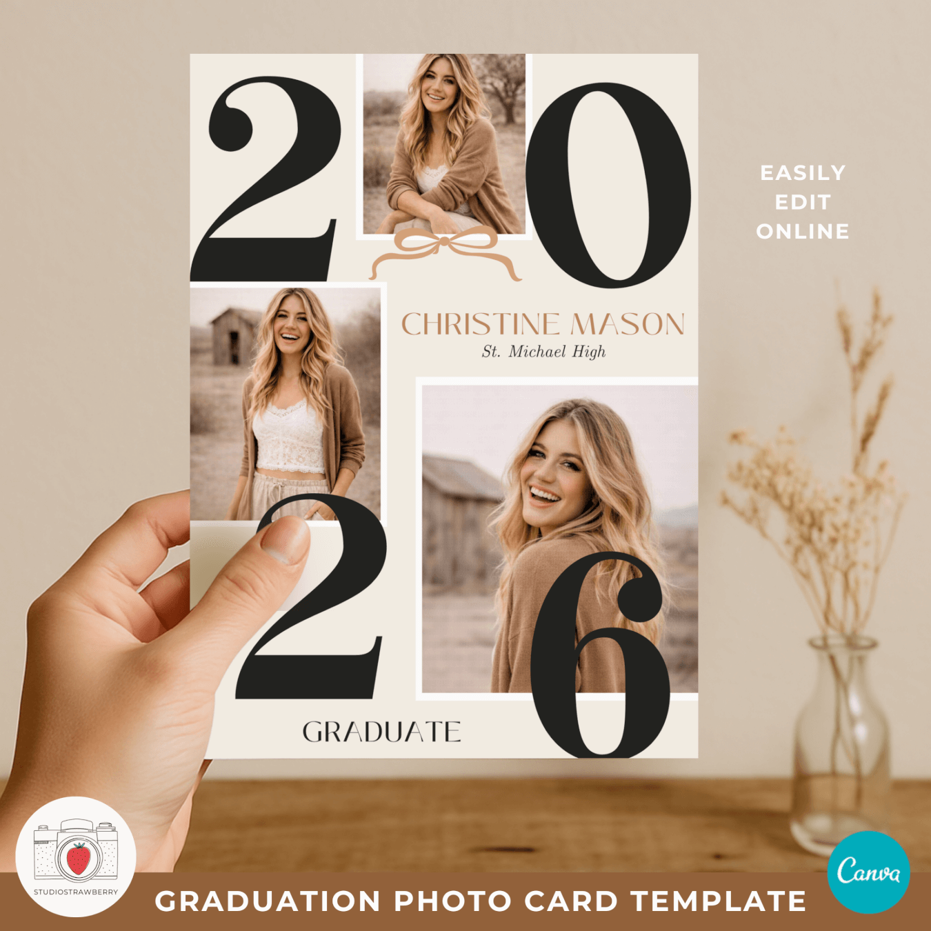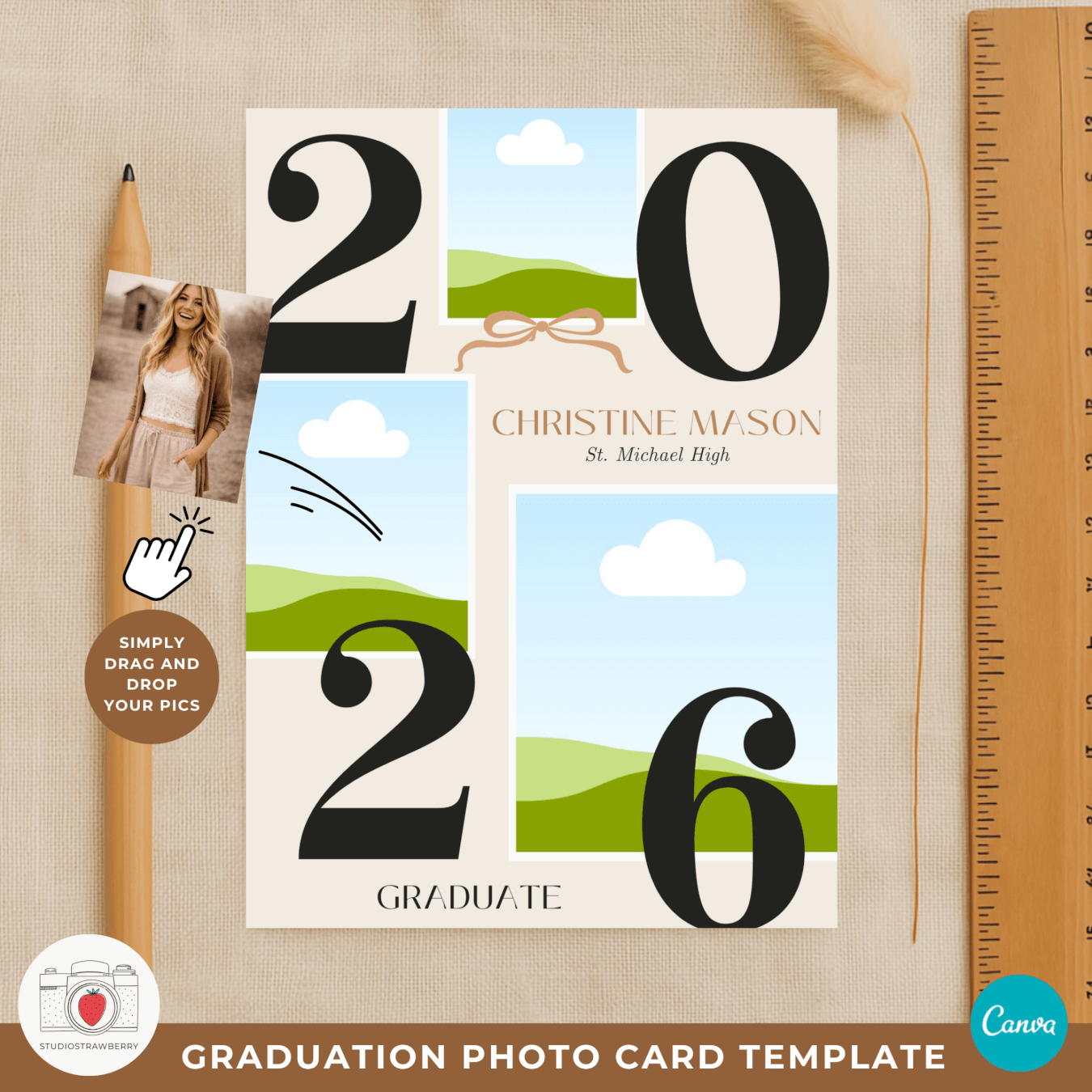 This 2026 graduation photo card Canva template is designed for celebrating graduation in a calm, modern, and personal way. Featuring a bold number graduation photo card layout, soft neutral beige colors, a subtle bow detail, and a cottagecore inspired look, this template is ideal for anyone searching for a class of 2026 photo card that feels timeless and stylish. The design works beautifully as an editable graduation announcement 2026 or as a graduation invitation template 2026, giving you flexibility without needing multiple products.