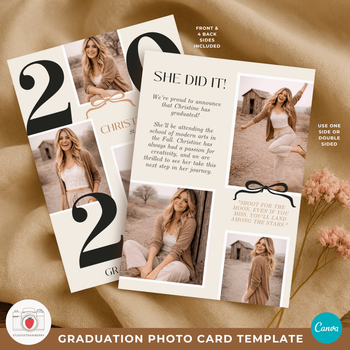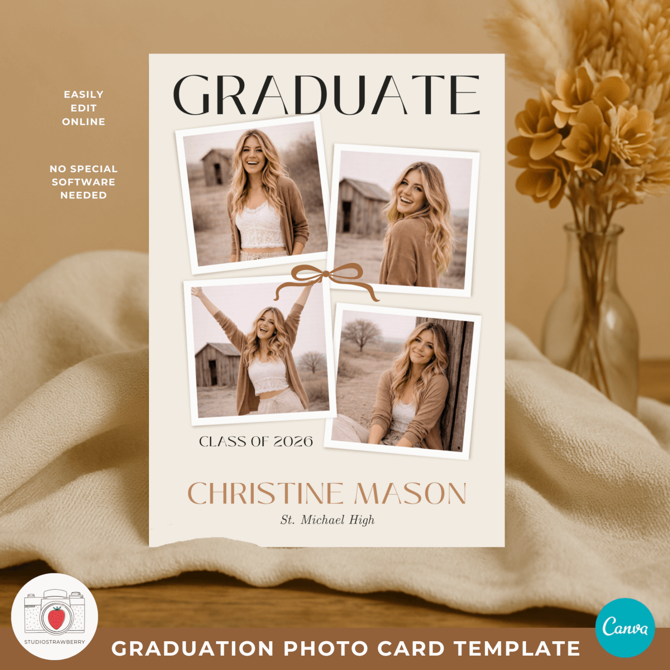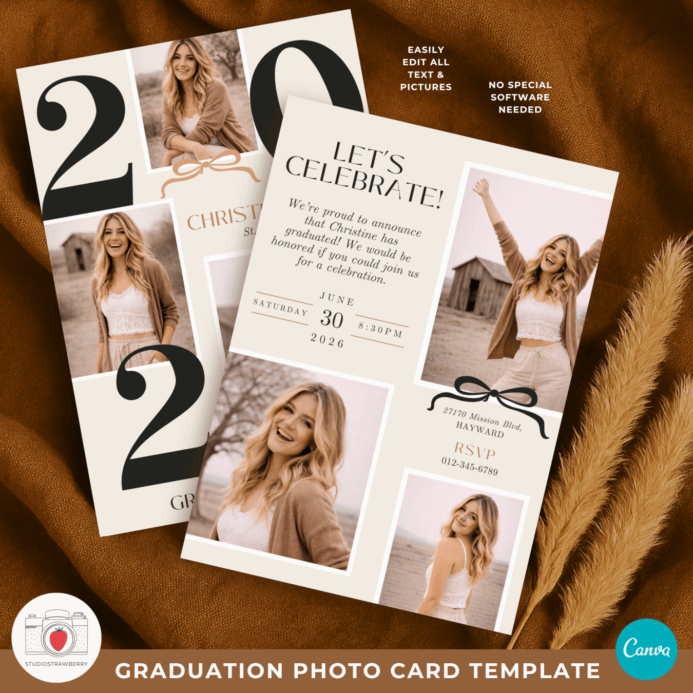 This 2026 graduation photo card Canva template is designed for celebrating graduation in a calm, modern, and personal way. Featuring a bold number graduation photo card layout, soft neutral beige colors, a subtle bow detail, and a cottagecore inspired look, this template is ideal for anyone searching for a class of 2026 photo card that feels timeless and stylish. The design works beautifully as an editable graduation announcement 2026 or as a graduation invitation template 2026, giving you flexibility without needing multiple products.