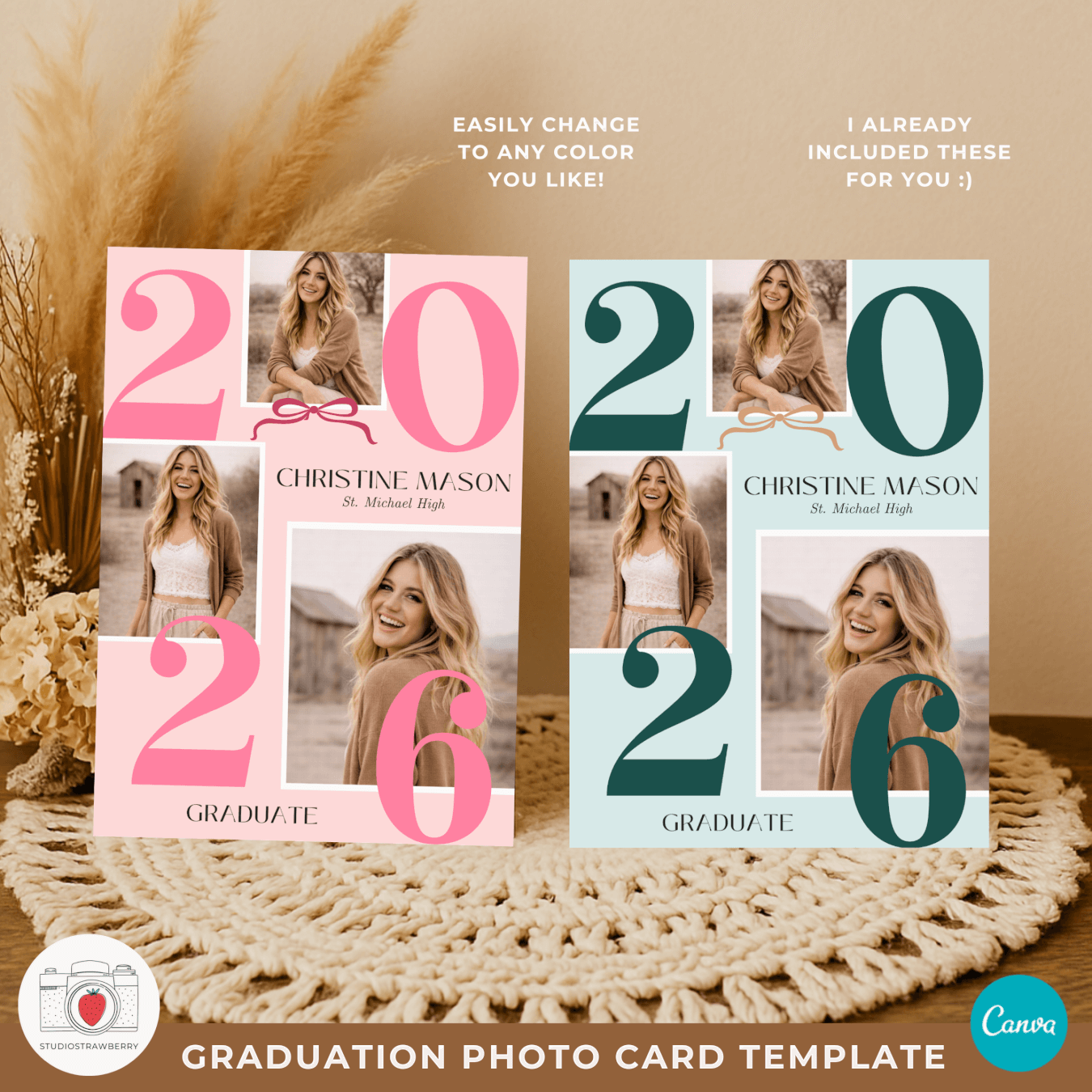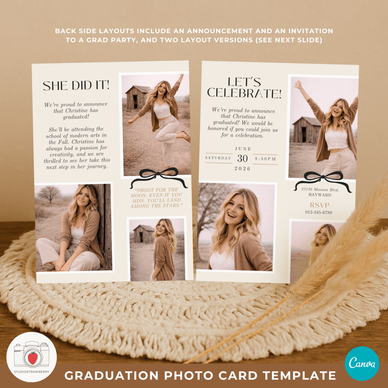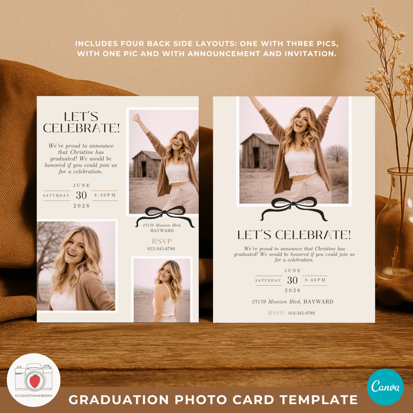 This graduation photo card Canva template includes one front design and four back side layouts, all inside one easy to use Canva project. You can choose between a graduation photo collage card with three pictures or a clean one photo layout. Both options are available as a high school graduation announcement 2026 or as a graduation party invitation with photos. This makes it simple to create a printable graduation photo card that fits your exact plans.